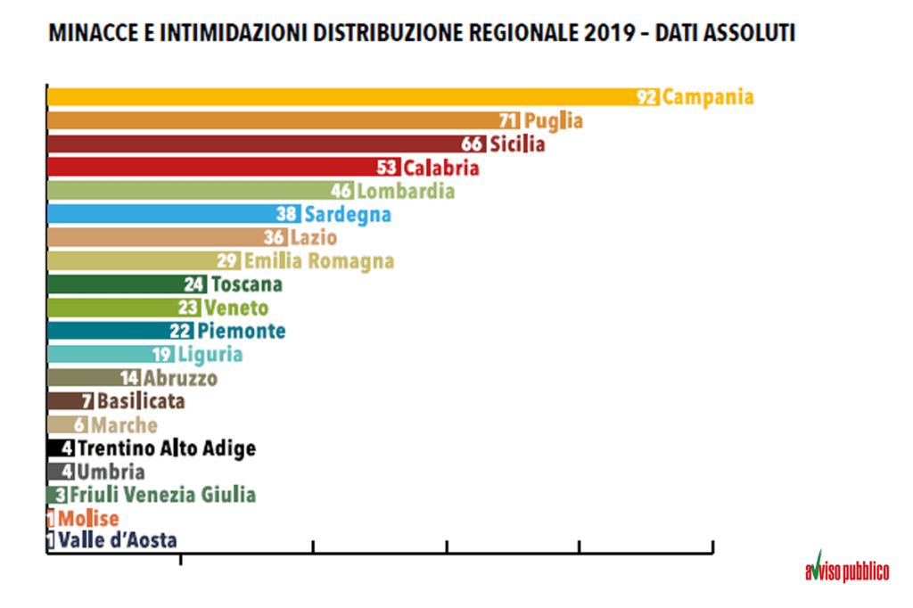 Le regioni – Come detto, per la seconda volta nella storia del rapporto, sono coinvolte tutte le regioni italiane anche se, ovviamente, in misura differente. Il triste primato per il maggior numero delle aggressioni se lo è aggiudicato per il terzo anno consecutivo la Campania con 92 episodi nel corso del 2019 e 217 se si considera il triennio 2017-2019. Dati che fanno rabbrividire e che significano un attacco ogni quattro giorni evidenziando le criticità della regione. Dietro alla Campania si trovano altre 3 regioni del sud Italia: la Puglia (71 casi), la Sicilia (66) e la Calabria (53). Ma se le prime quattro posizioni non sorprendono, confermando i livelli registrati negli anni precedenti, la prima sorpresa arriva dal Nord Italia. Al quinto posto infatti si trova, con 46 atti intimidatori e un incremento del 64% in due anni, la Lombardia. La presenza pervasiva della criminalità organizzata calabrese e di un sistema corruttivo sempre più diffuso rendono infatti gli amministratori locali della regione “locomotiva d’Italia” maggiormente esposti ad episodi di questo tipo. In particolare, emerge il ruolo della città Metropolitana di Milano in cui si sono registrati nel corso del 2019 ben 16 casi che rendono il capoluogo lombardo la nona provincia per numero di intimidazioni.